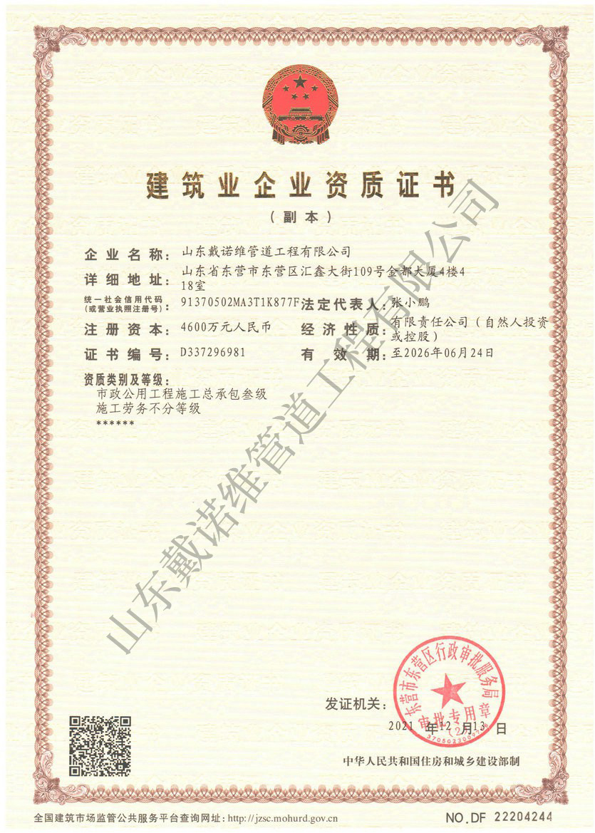 管道非開挖修復工程服務企業(yè)資質(zhì)證書